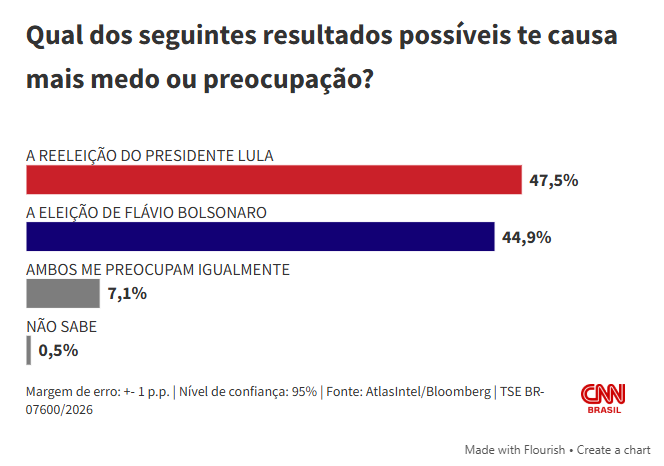 De acordo com o levantamento divulgado nesta quarta-feira, 47,5% dos entrevistados afirmaram ter receio da continuidade de Lula no comando do país. Já 44,9% disseram temer uma vitória de Flávio Bolsonaro. Outros 7,1% demonstraram preocupação com ambos os cenários, enquanto 0,5% não souberam responder.
