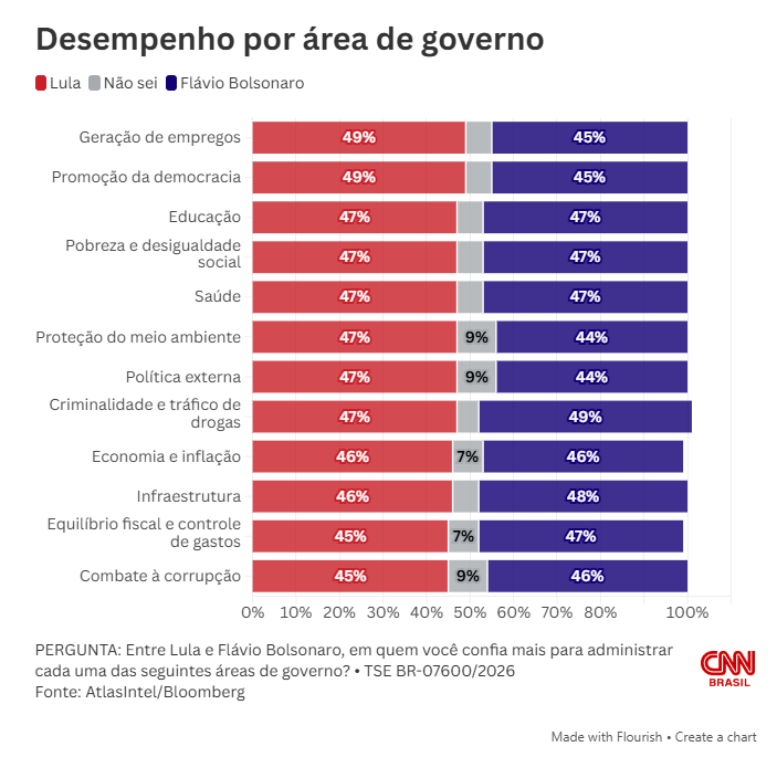 Por outro lado, Flávio Bolsonaro lidera em temas ligados à segurança pública e gestão fiscal. Ele registra 49% em criminalidade e tráfico de drogas, contra 47% de Lula. Também aparece à frente em infraestrutura, equilíbrio fiscal e controle de gastos, além de combate à corrupção.