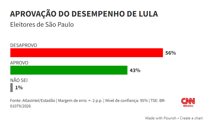 Pesquisa divulgada nesta quarta-feira, 1º de abril de 2026, pelo instituto AtlasIntel em parceria com o Estadão mostra que 56% dos paulistas desaprovam o presidente Luiz Inácio Lula da Silva, enquanto 43% aprovam sua gestão. Outros 1% não souberam responder.