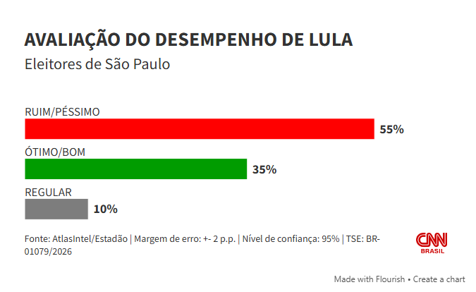 Além dos índices de aprovação, o levantamento também mediu a avaliação do governo. Nesse recorte, o cenário é ainda mais desafiador: 55% classificam a gestão como ruim ou péssima, enquanto 35% a consideram ótima ou boa. Outros 10% avaliam como regular.