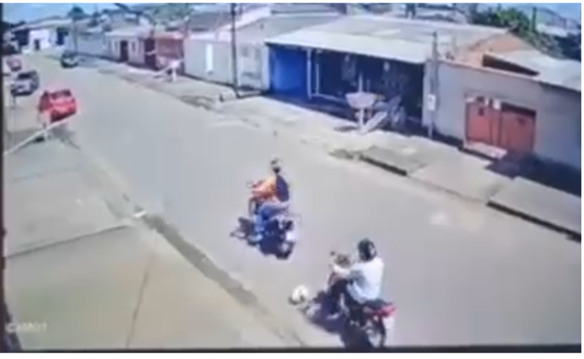 Nas imagens é possível ver quando dois indivíduos chegam de moto e um deles vai até o veículo que está na calçada de uma residência, depois empurra a mesma até o asfalto e foge sendo rebocado pelo comparsa.