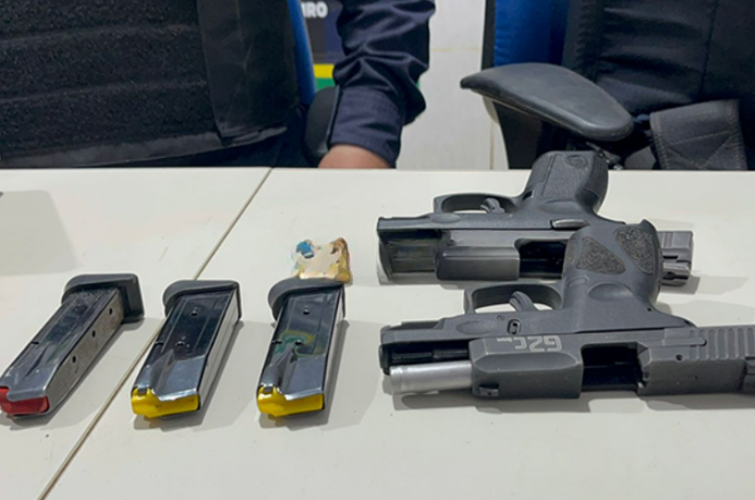 Durante a revista, os agentes encontraram duas pistolas: uma 9mm, com dois carregadores e uma munição intacta no banco do motorista, e uma .380 com um carregador e duas munições no banco do passageiro. A pistola 9mm, segundo o sistema da polícia, constava como furtada.