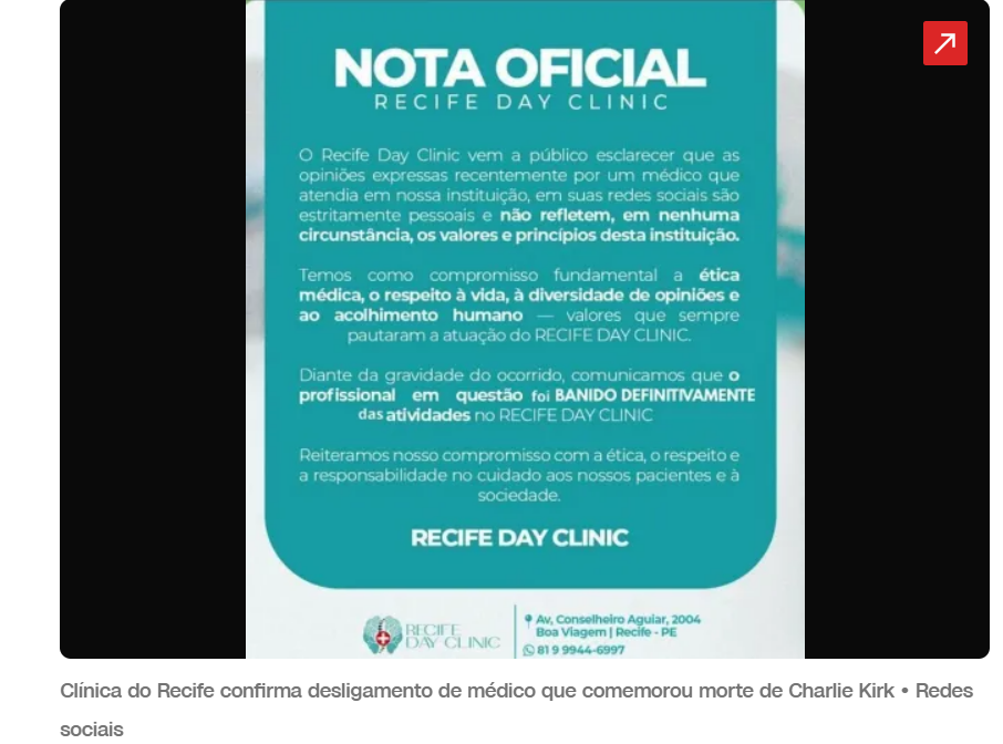 O médico afirmou que o comentário não reflete suas convicções e pediu desculpas à família do ativista, alegando que a postagem foi distorcida por montagens e compartilhamentos fora de contexto. “Sempre fui contrário ao uso de armas e defensor da paz. O conteúdo original em nada condiz com os princípios que sempre nortearam minha conduta pessoal e profissional: o respeito à vida e à ética”, declarou Barbosa.