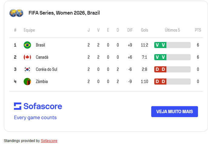 Além da vitória expressiva, o Brasil segue na ponta pelo saldo de gols. Após vencer a Seleção Coreana Feminina de Futebol por 5 a 1 e golear a Seleção Zambiana Feminina de Futebol por 6 a 1, a equipe soma nove gols de saldo. O Seleção Canadense Feminina de Futebol aparece na segunda colocação, com seis, após triunfos por 4 a 0 sobre as africanas e 3 a 1 diante das asiáticas.