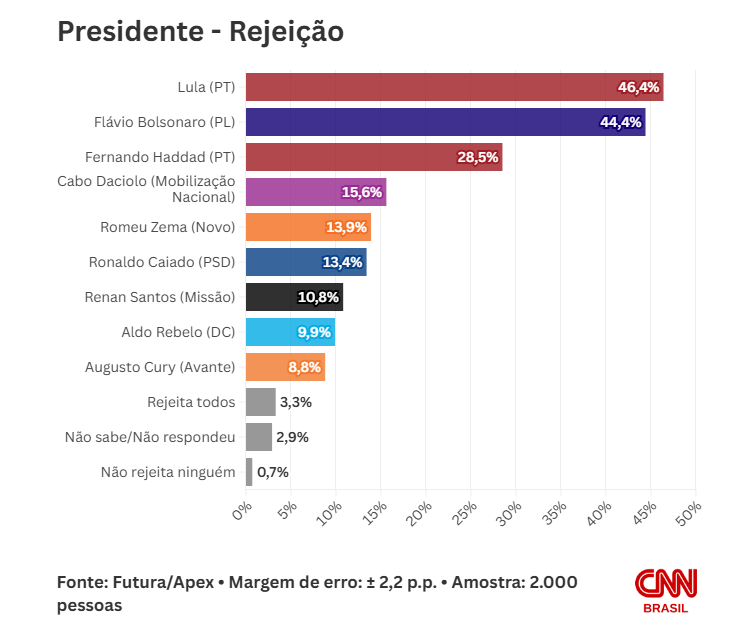 O levantamento também aponta os índices de rejeição do governador de Goiás Ronaldo Caiado, com 13,4%; do fundador do Movimento Brasil Livre, Renan Santos, com 10,8%; do ex-ministro Aldo Rebelo, com 9,9%; e do escritor Augusto Cury, com 8,8%.