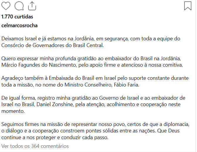 Nas redes sociais, Marcos Rocha agradeceu o apoio recebido durante a permanência em Israel, destacando o trabalho conjunto da diplomacia brasileira. Entre os nomes citados, estão o embaixador do Brasil na Jordânia, Márcio Fagundes do Nascimento, e o Ministro-Conselheiro da Embaixada do Brasil em Israel, Fábio Faria, além do embaixador de Israel no Brasil, Daniel Zonshine.