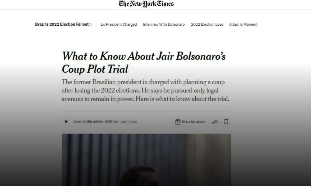 O Brasil entra hoje para as páginas da história. O julgamento do ex-presidente Jair Bolsonaro (PL) e de outros sete réus pelo STF (Supremo Tribunal Federal), acusado de tentar articular um golpe de Estado, ganhou repercussão imediata na imprensa internacional. A atenção global reflete não apenas a gravidade das acusações, mas também a dimensão inédita de ver um ex-chefe de Estado sentado no banco dos réus por tentar subverter a democracia.