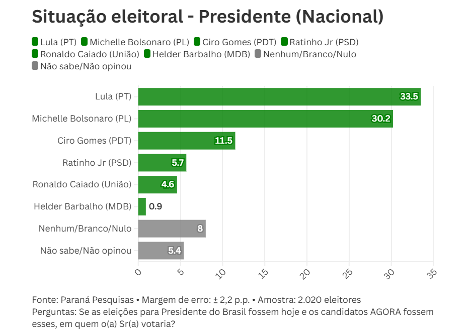 Neste cenário, Lula se mantém competitivo, empatado tecnicamente com Bolsonaro, ambos com percentuais próximos, enquanto Michelle Bolsonaro segue como opção expressiva entre o eleitorado. Ciro Gomes aparece como terceira via, ainda com chances de influenciar a disputa.