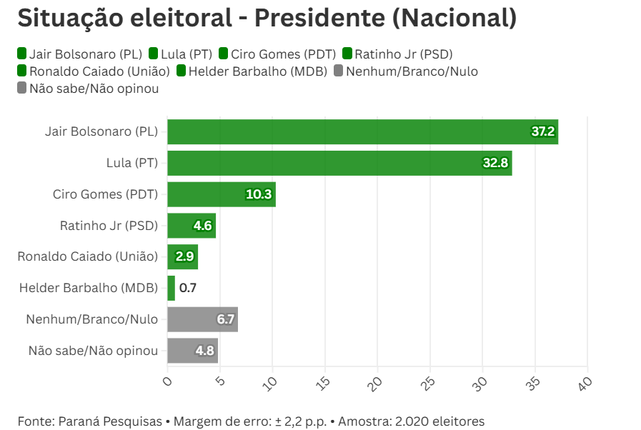 No primeiro cenário testado, Jair Bolsonaro lidera com 37,2% das intenções de voto, seguido por Lula, com 32,8%. Apesar da diferença numérica, a margem de erro de 2,2 pontos percentuais indica um empate técnico entre os dois. Surpreendentemente, Michelle Bolsonaro também figura como uma concorrente forte, reforçando a divisão de forças dentro do eleitorado.