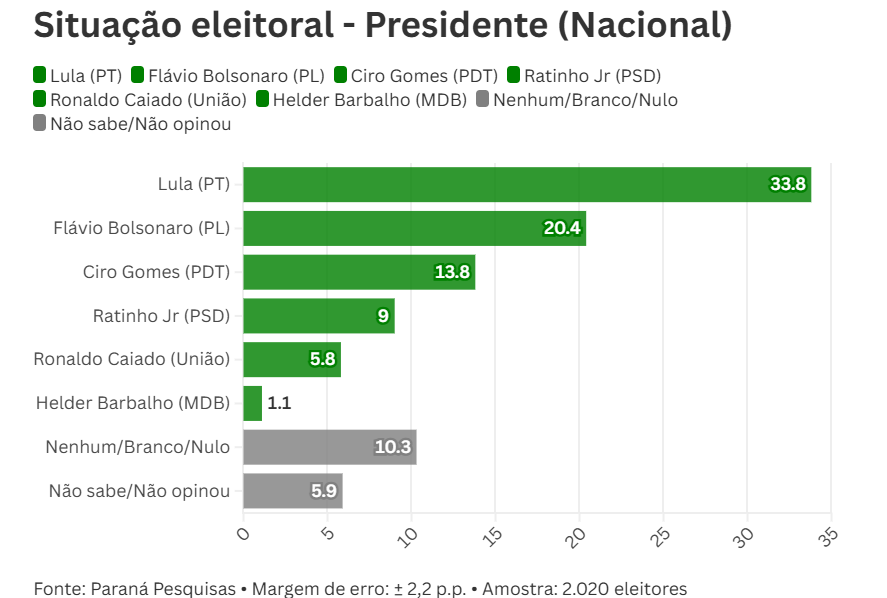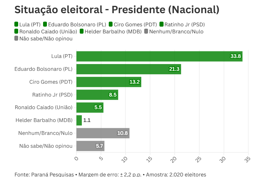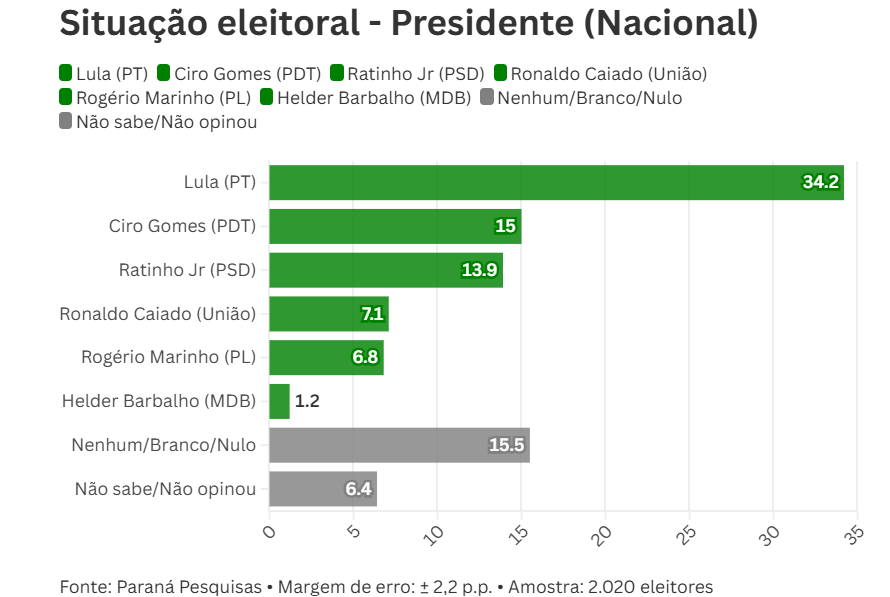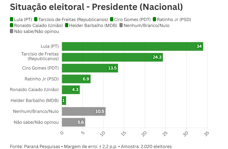 Outros nomes aparecem com menor destaque, como o ex-presidenciável Ciro Gomes (PDT), que pontua 10,3%, e o governador do Paraná, Ratinho Jr. (PSD), com 4,6%. Já os governadores Ronaldo Caiado (União) e Helder Barbalho (MDB) têm 2,9% e 0,7%, respectivamente.