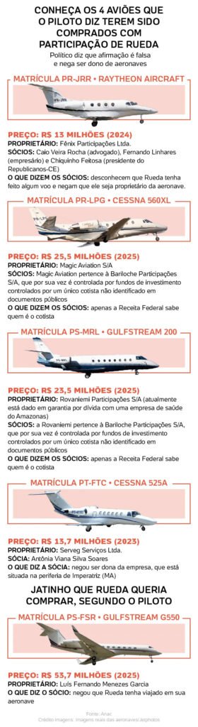 - Raytheon 390 Premier, PR-JRR – oficialmente da Fênix Participações, com transações envolvendo empresários próximos a Rueda.