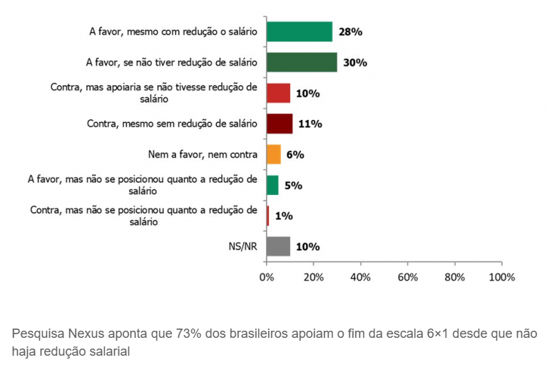 Quando a possibilidade de receber menos entra na equação, o cenário muda drasticamente: apenas 28% seriam favoráveis ao fim da escala se isso significasse diminuição no salário ao final do mês. No panorama geral, sem considerar o impacto financeiro, 63% se dizem a favor da proposta, enquanto 22% se posicionam contra.