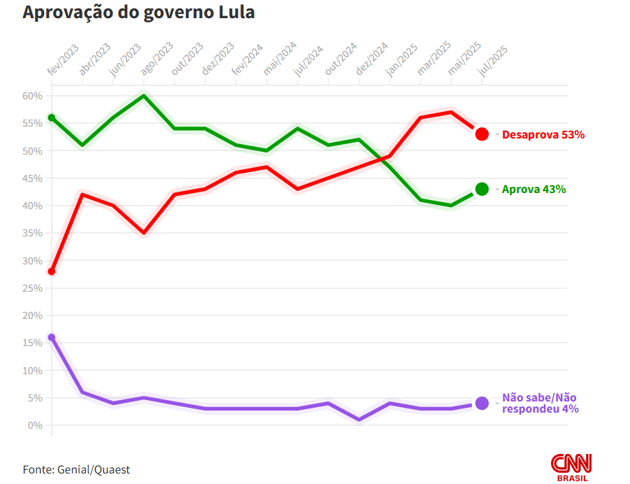 Os dados foram coletados entre os dias 10 e 14 de julho, com 2.004 entrevistas presenciais em todo o país. A margem de erro é de dois pontos percentuais, para mais ou para menos, com nível de confiança de 95%.