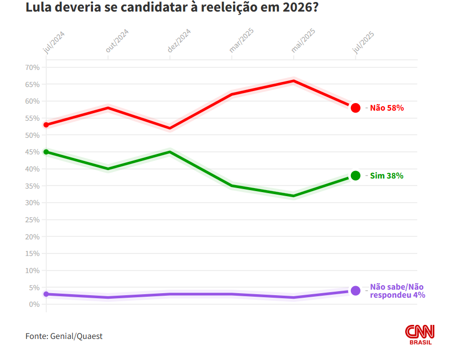Segundo o levantamento, 58% dos entrevistados acreditam que Lula não deveria tentar a reeleição, enquanto 38% acham que ele deve disputar mais um mandato. Outros 4% não souberam ou preferiram não responder. Apesar da rejeição majoritária, os números mostram uma leve mudança de percepção: houve queda de oito pontos entre os que não querem a candidatura de Lula e um crescimento de seis pontos entre os que apoiam.