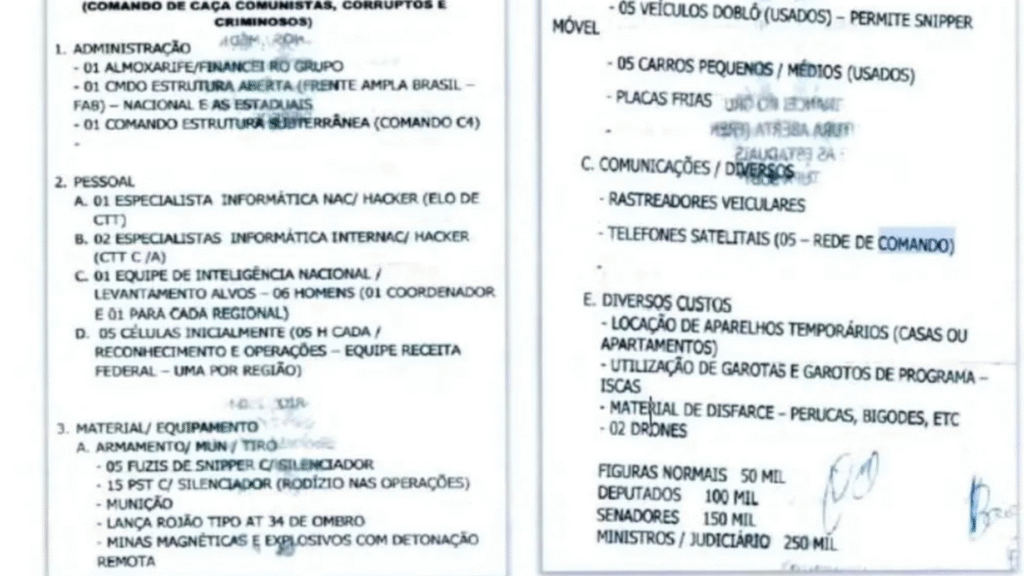 A partir daí, a PF chegou a um esquema que inclui desde monitoramento por drones, uso de disfarces, perucas, bigodes falsos e até a contratação de garotas e garotos de programa como “iscas” para atrair alvos. O cardápio do terror ia além: o grupo possuía um arsenal com fuzis de precisão com silenciador, pistolas, minas magnéticas, explosivos e até lança-rojões. Parte desse material foi encontrado em uma operação em Minas Gerais.
