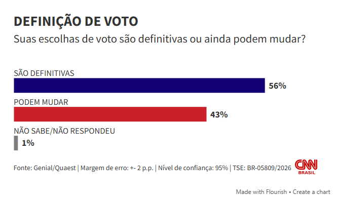 Segundo pesquisa da Genial Quaest, divulgada nesta terça-feira (17), 56% dos entrevistados afirmam que suas escolhas para presidente são definitivas. Por outro lado, 43% dizem que ainda podem mudar de opinião, enquanto 1% não soube ou preferiu não responder.